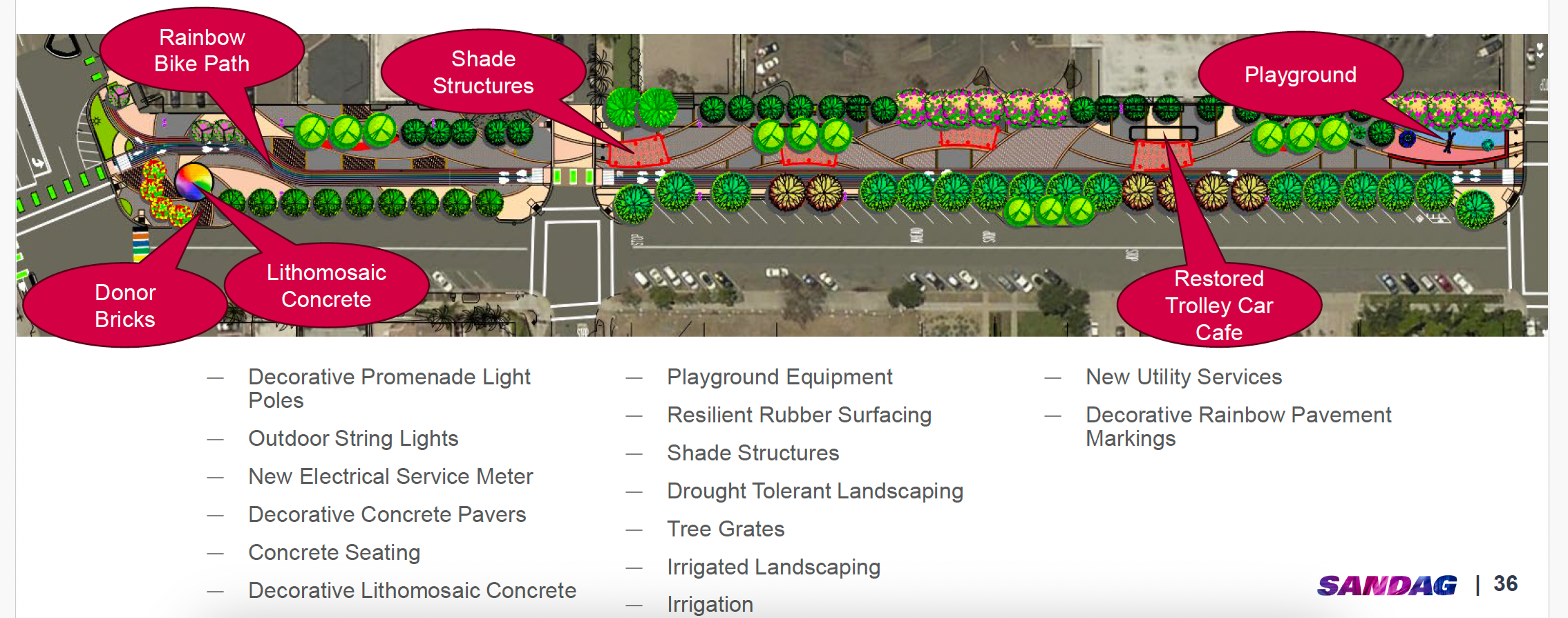 Pride Promenade is still under construction. There’s a lot going on at the site as we get ready to open in February or March of 2026. At the same time, planning for the Promenade is well underway. Teams of students from the University of San Diego Knauss Business School have been studying ways to make the Promenade work well and have made a number of suggestions regarding management of the space. Planning for an annual calendar of events is underway. And a variety of other exciting opportunities are being considered. Below are some of the interesting items being planned for the Promenade.