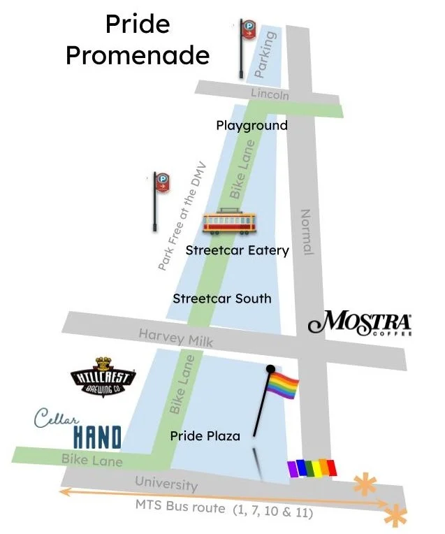 Community donations and support are critical to the success and vibrancy of Pride Promenade. The Hillcrest Community Foundation is raising charitable funds to support operations for the Promenade. There are variety of ways you can support our community space. If you’d like to help us raise money for the Promenade, please reach out to us at info@hillcrestbia.org.